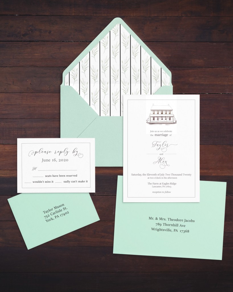 This simple and sweet invitation collection will delight your guests. A custom illustration of your wedding venue adorns the top of the invitation, giving guests their first sneak peak at your wedding! The colors of the fonts and envelopes can be customized to fit your vision. The base set includes a black and white custom illustration, 5″ x 7″ invitation, a 3.5″ x 5″ RSVP card printed on 110 lb white or off white paper, and blank envelopes for the RSVP and invitations.